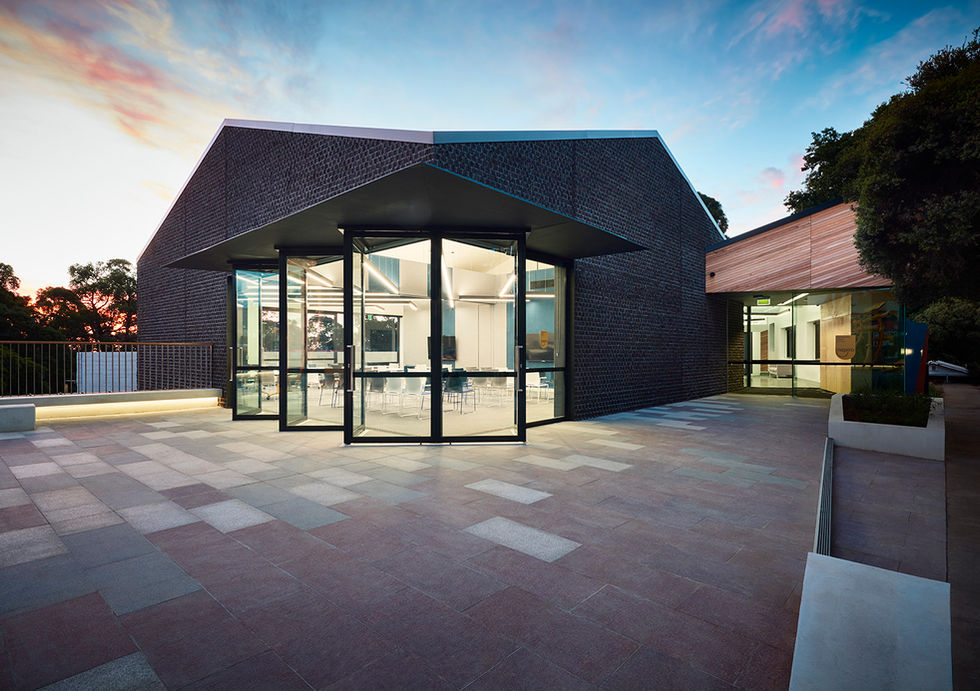 The steel roof structure is uniquely shaped and façade of the building features many architectural elements including feature brickwork, patterned precast concrete, glazing, silvertop timber battens. Externally the building is completed with concrete pavements, pavers, feature crib walls, timber decking, precast concrete seating, fencing, play equipment and detailed soft landscaping works.